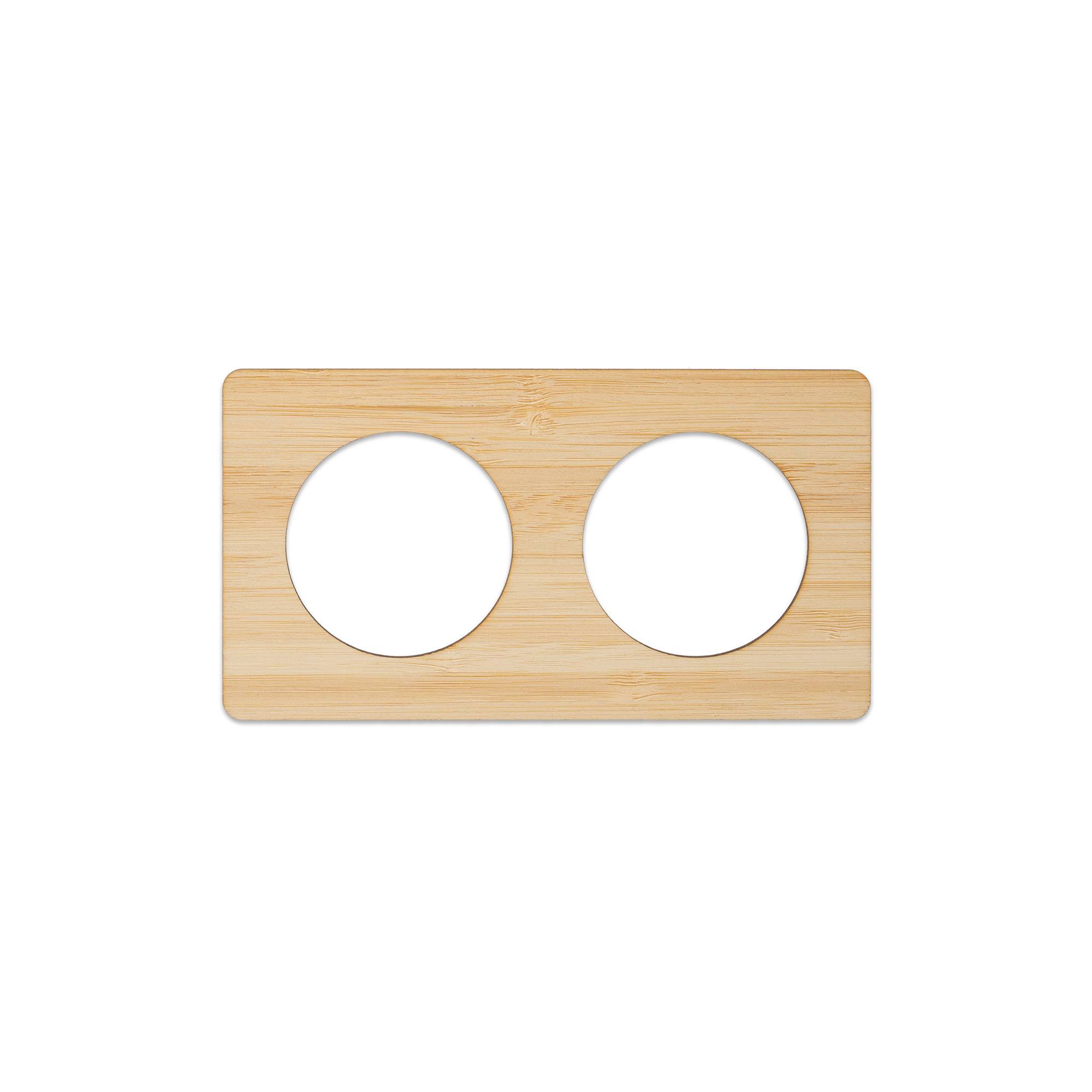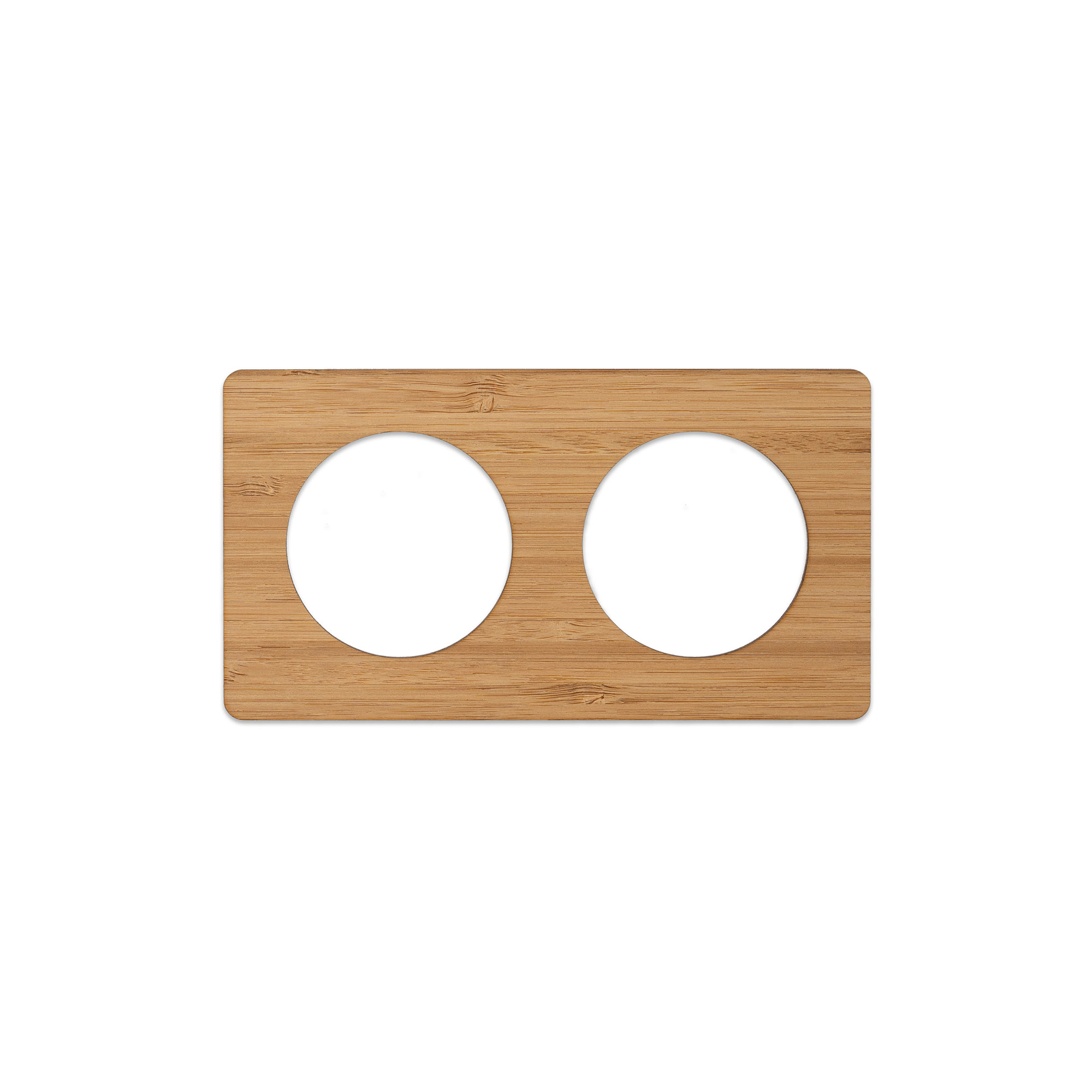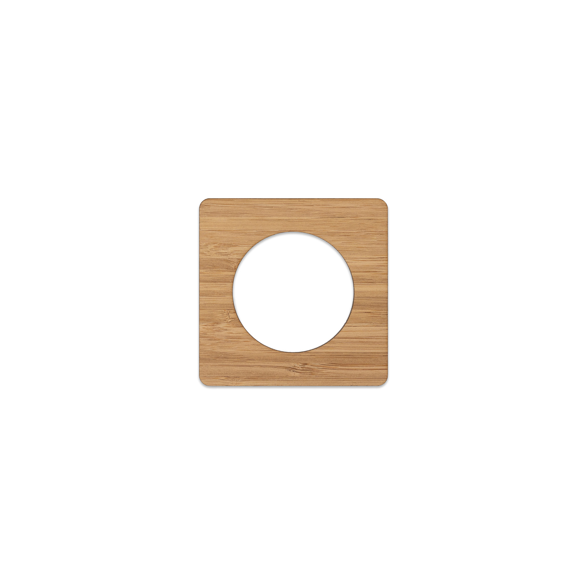 Mooie echt bamboehouten Decoplates plakfrontjes, compatibel met rondvormig Odace schakelmateriaal van merk Schneider Electric. De bamboe frontjes voor deze ronde afdekramen zijn standaard leverbaar in de kleuren geel en bruin. Het bamboe komt uit China en wordt als side-pressed fineer tot plaatmateriaal geproduceerd door onze Nederlandse materiaalpartner Kuiper Holland. De gele bamboe is vanillegeel qua kleurstelling met goudgele nerven, waar de bruine bamboe caramelbruine tot gouden nerven presenteert.