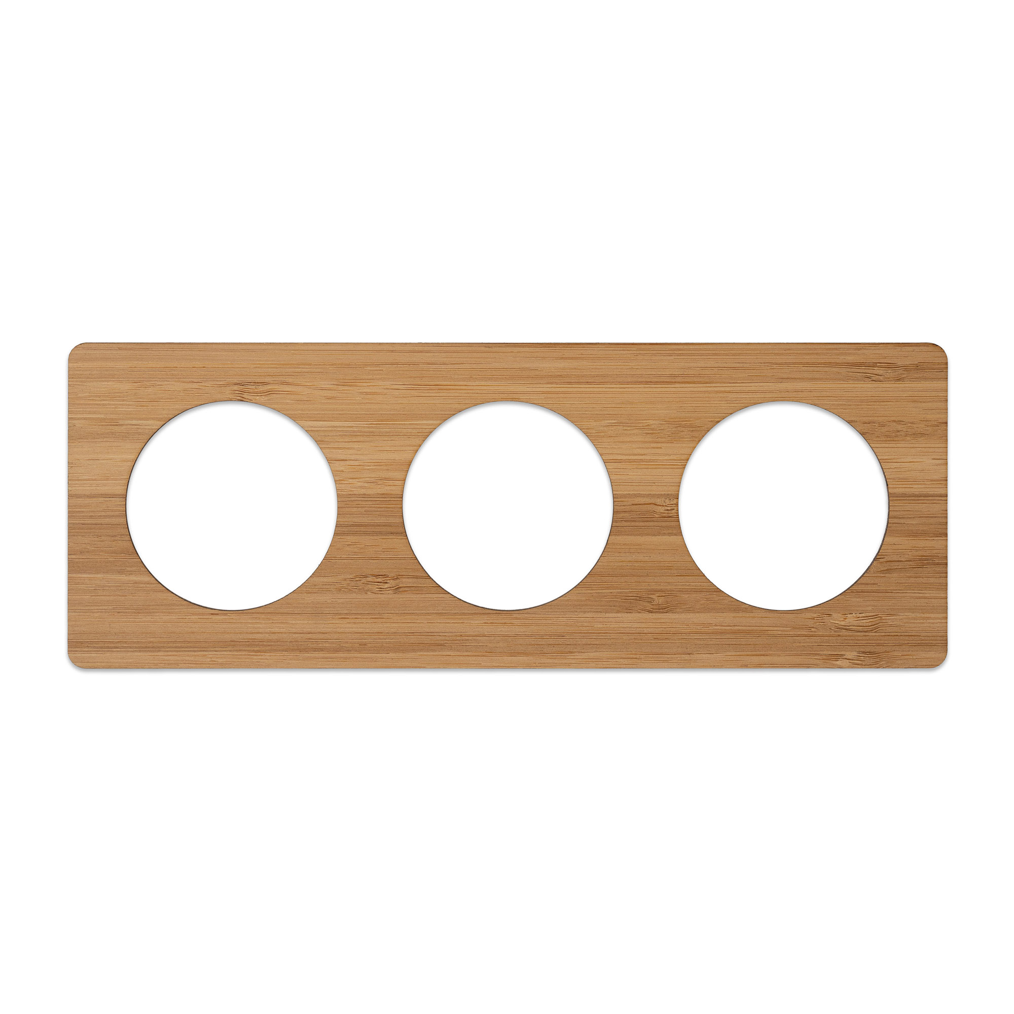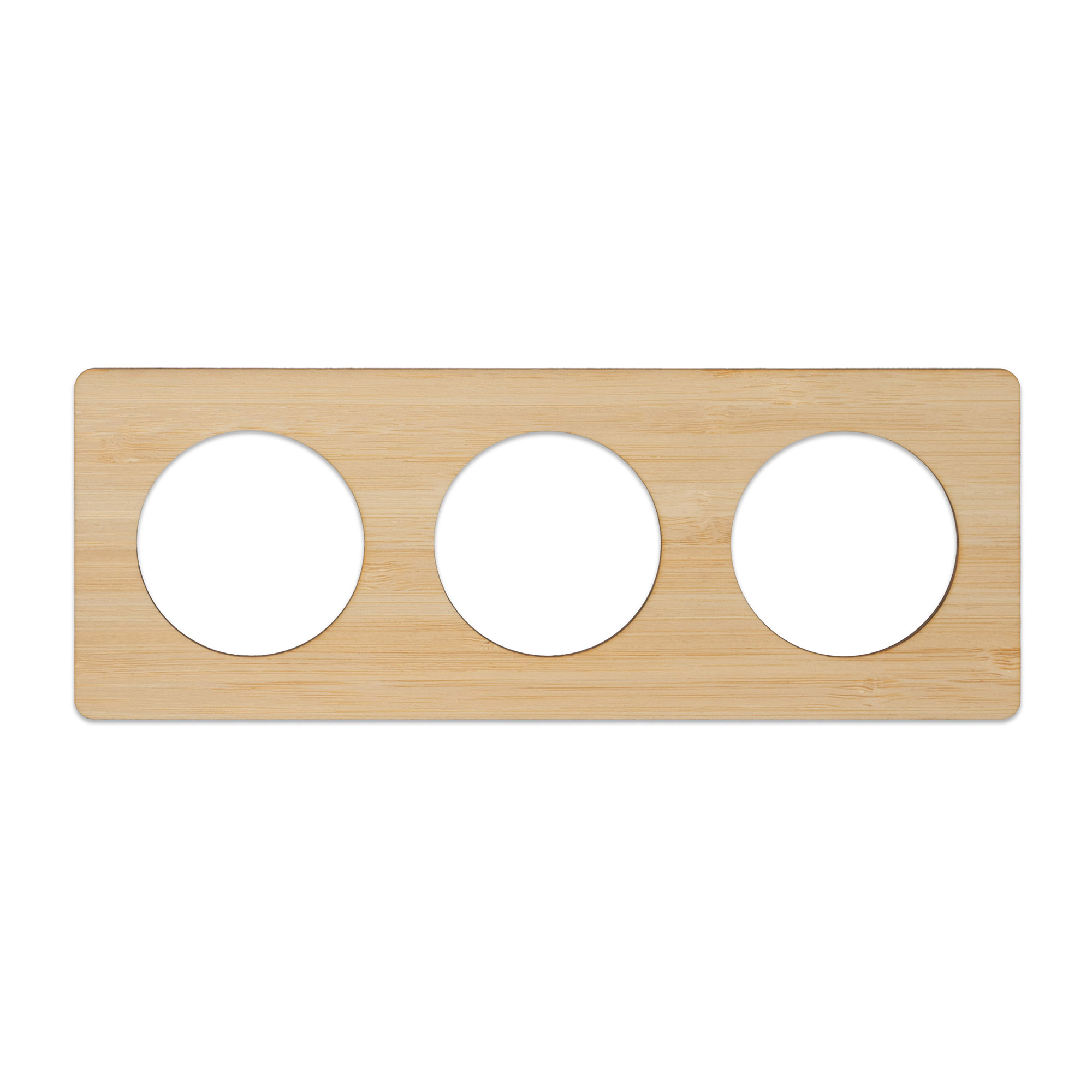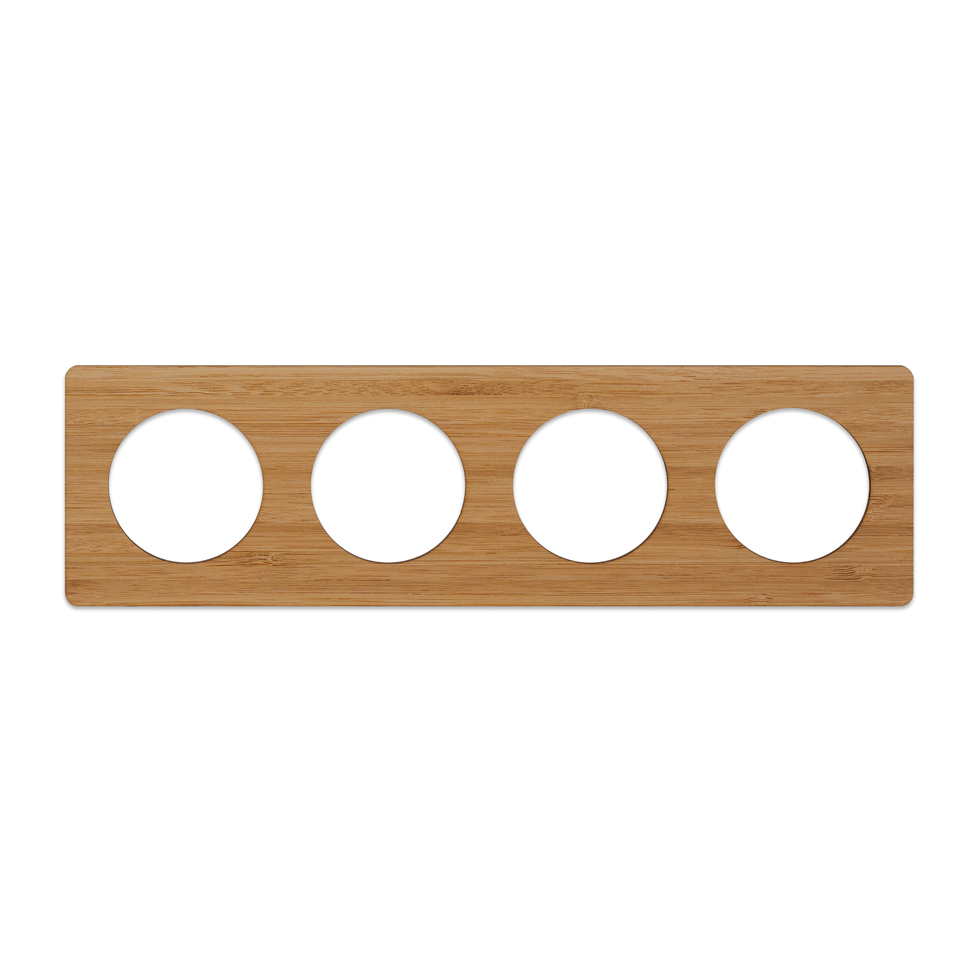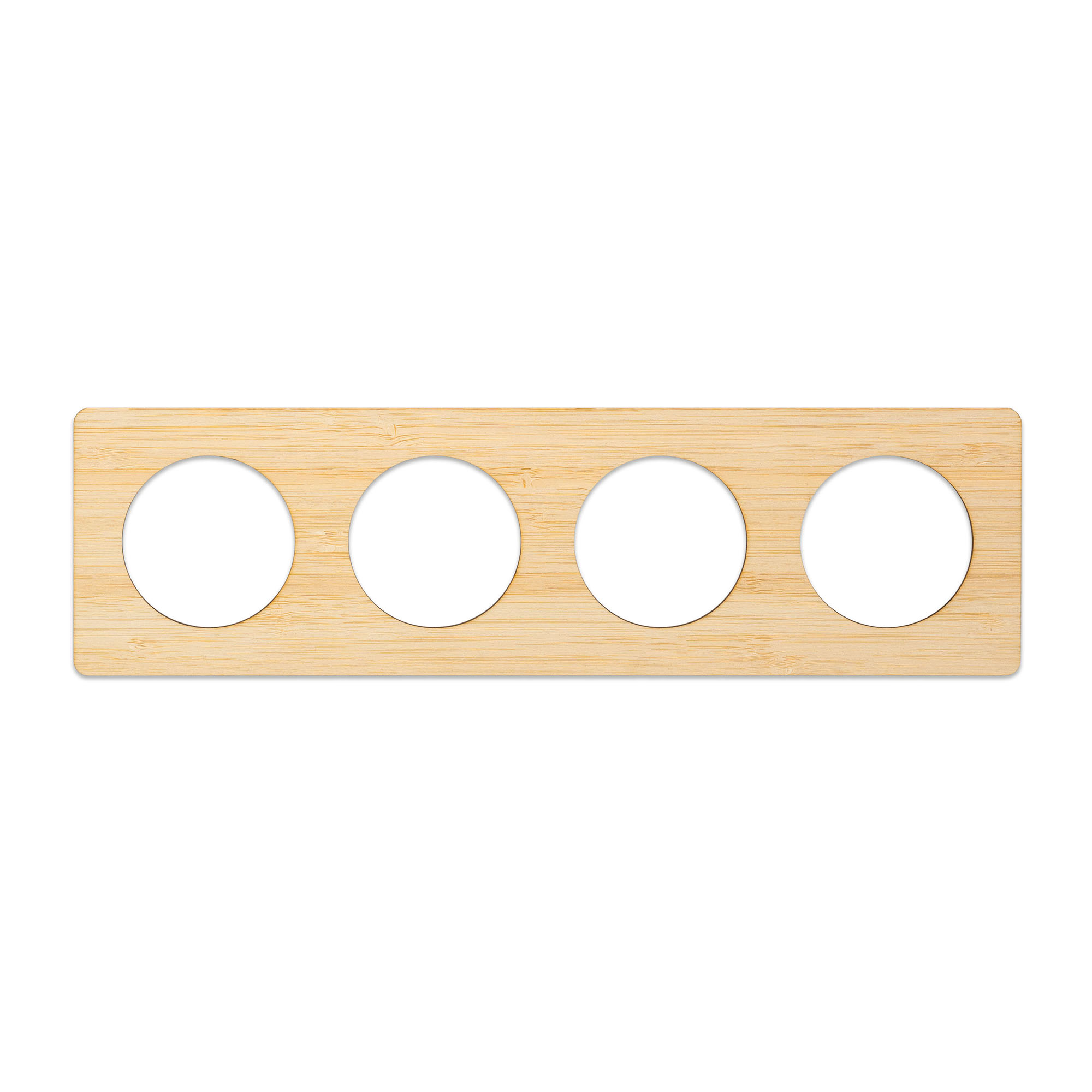 Mooie echt bamboehouten Decoplates plakfrontjes, compatibel met rondvormig Odace schakelmateriaal van merk Schneider Electric. De bamboe frontjes voor deze ronde afdekramen zijn standaard leverbaar in de kleuren geel en bruin. Het bamboe komt uit China en wordt als side-pressed fineer tot plaatmateriaal geproduceerd door onze Nederlandse materiaalpartner Kuiper Holland. De gele bamboe is vanillegeel qua kleurstelling met goudgele nerven, waar de bruine bamboe caramelbruine tot gouden nerven presenteert.